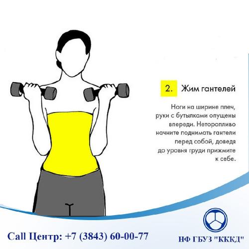 2 «Жим гантелей» - ускоряет жировой обмен, снижает концентрацию плохого холестерина и триглицеридов крови, предупреждает развитие атеросклероза