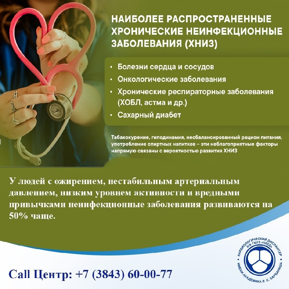 К наиболее распространённым неинфекционным заболеваниям относятся заболевания сердечно−сосудистой, бронхолёгочной системы, злокачественные новообразования, и сахарный диабет.