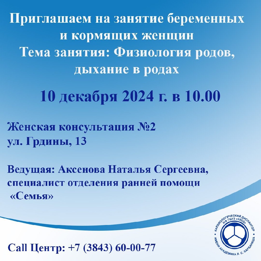 Узнать даты и записаться на предстоящие семинары для беременных можно, позвонив в колл-центр Новокузнецкого филиала Кузбасского кардиодиспансера   тел. 8 (3843) 60-00-77