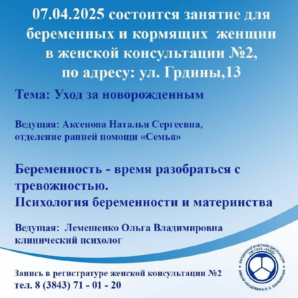 07.04.2025 состоится занятие для беременных и кормящих  женщин  в женской консультации №2, по адресу: ул. Грдины,13 в 10.00;