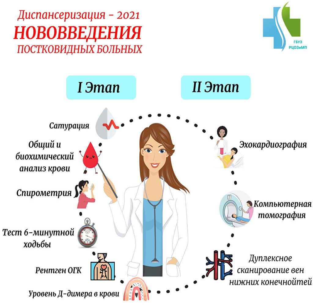 Цель углубленной диспансеризации — выявить изменения, возникшие после заболевания коронавирусной инфекцией, и направить усилия на предотвращение осложнений. Углубленная диспансеризация проходит в два этапа. Первый из них включает семь исследований: общий и биохимический анализы крови, измерение насыщения крови кислородом (сатурация), тест с 6-минутной ходьбой, спирометрия, рентген грудной клетки, прием терапевта. Для граждан, переболевших COVID-19, к этому списку добавится анализ на определение концентрации D-димера в крови, помогающий выявлять признаки тромб образования. Все эти обследования можно будет пройти за один день. По их результатам врачи определят риски и возможные признаки развития хронических заболеваний, при необходимости для уточнения диагноза направят пациента на второй этап. Он будет включать еще три обследования — эхокардиографию, КТ легких и допплеровское исследование сосудов нижних конечностей. Если по результатам диспансеризации у пациента выявят хронические заболевания или риски их возникновения, то ему будет проведено лечение и назначена медицинская реабилитация. Пройти углубленную диспансеризацию могут лица от 18 лет, перенесшие коронавирусную инфекцию, спустя 60 дней после выздоровления. Важно, чтобы о факте болезни было известно в поликлинике по месту прикрепления. В случае если данные о перенесенном заболевании в поликлинике отсутствуют, диспансеризацию можно пройти по инициативе гражданина